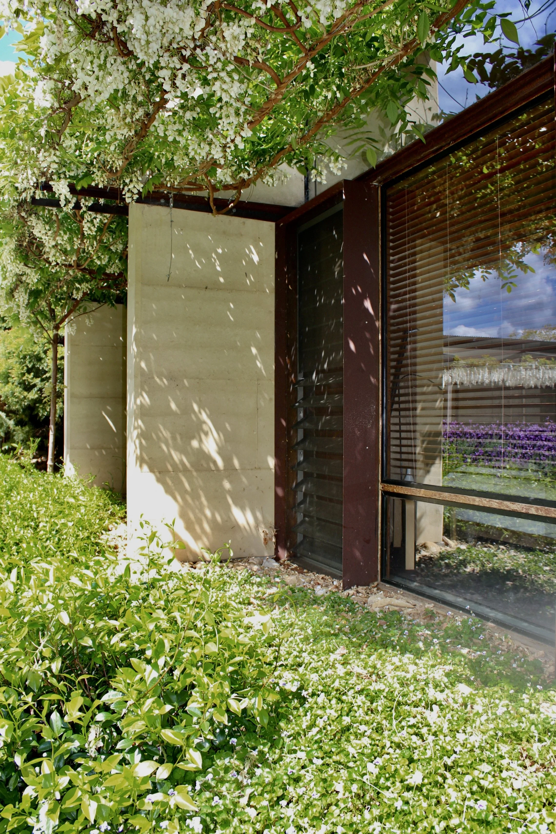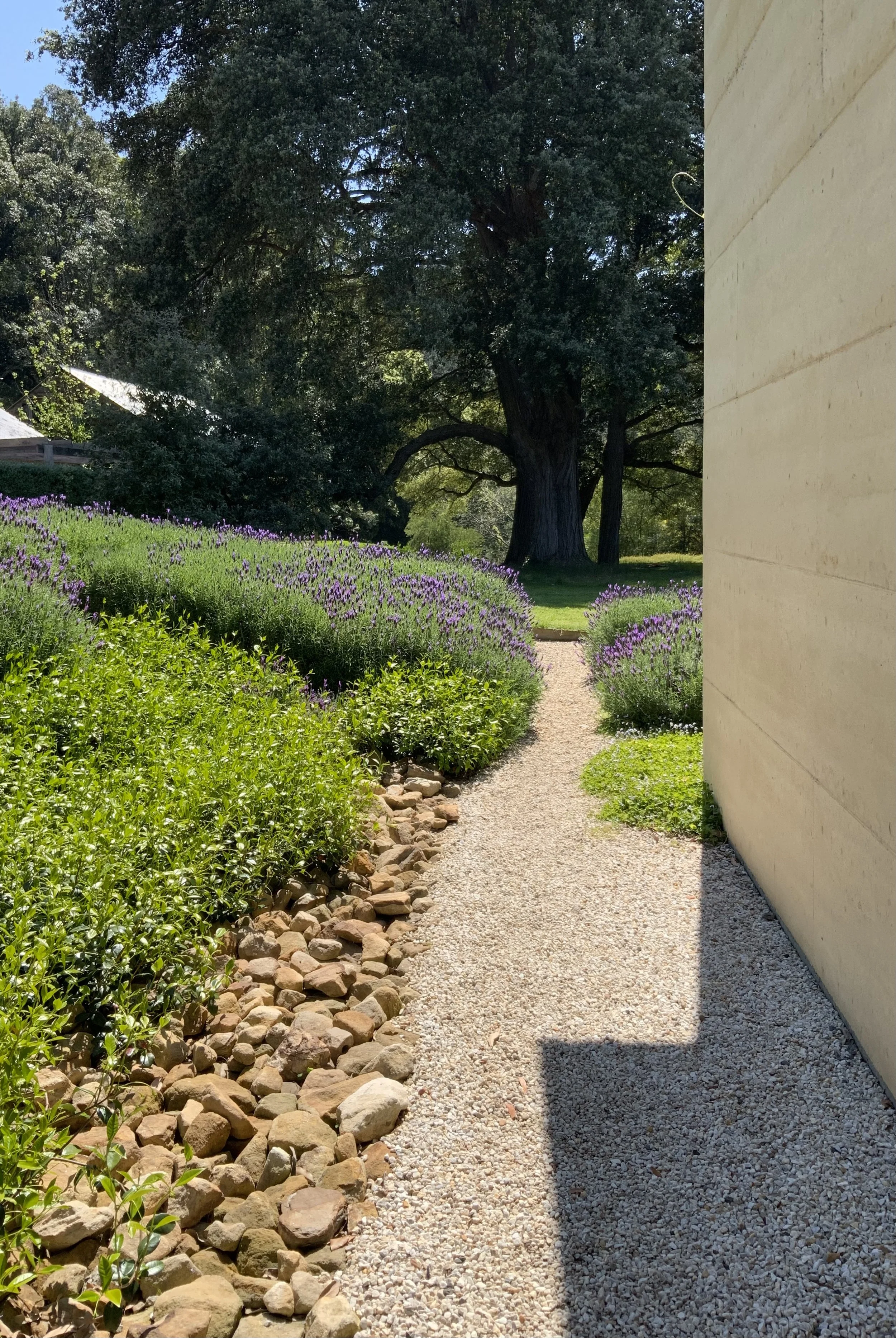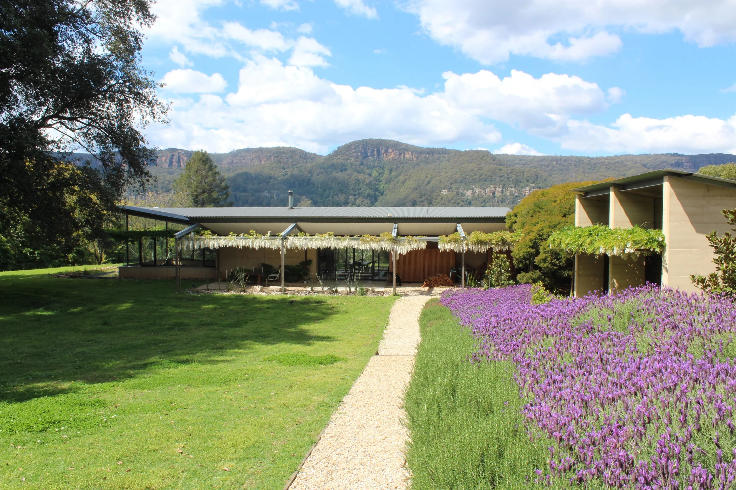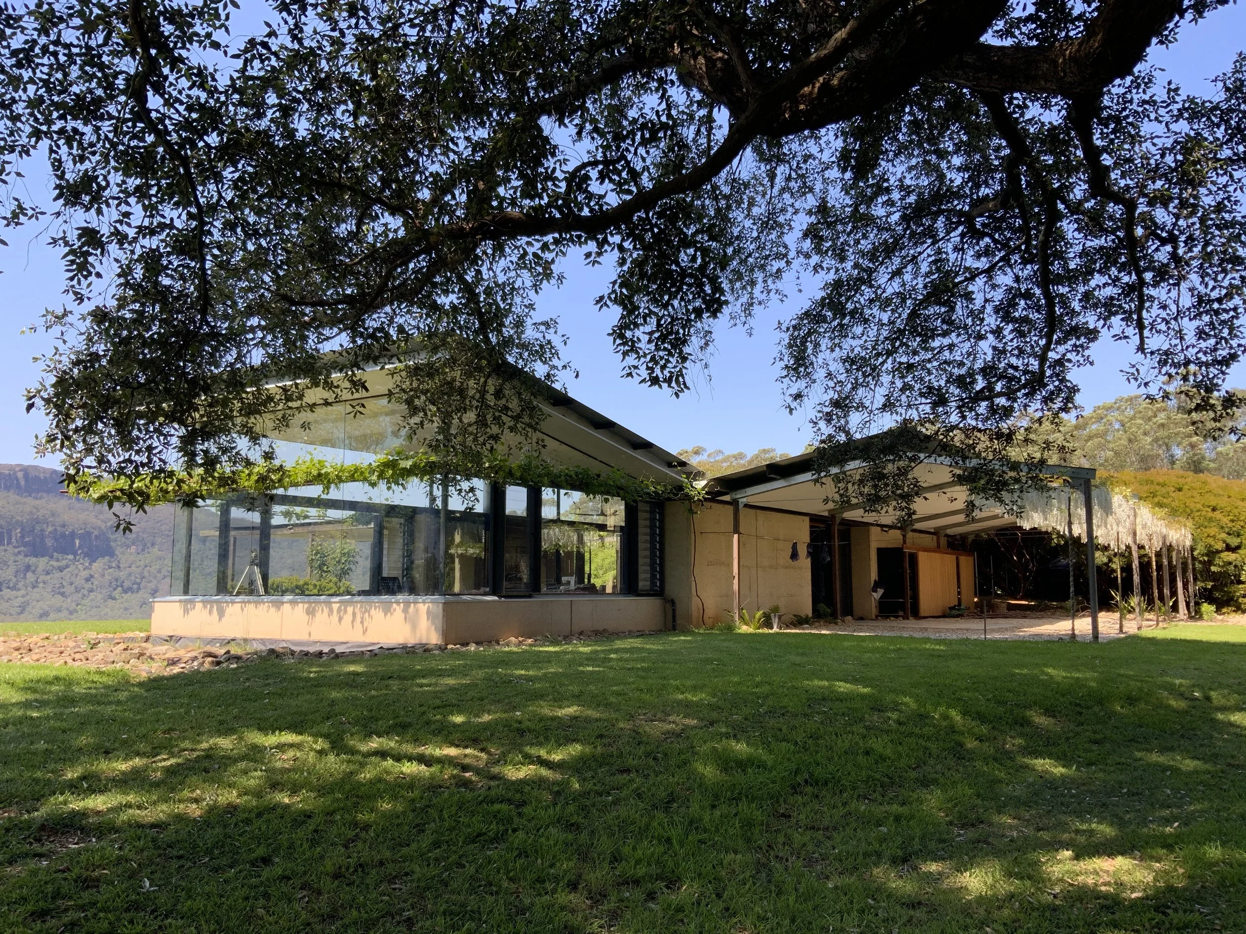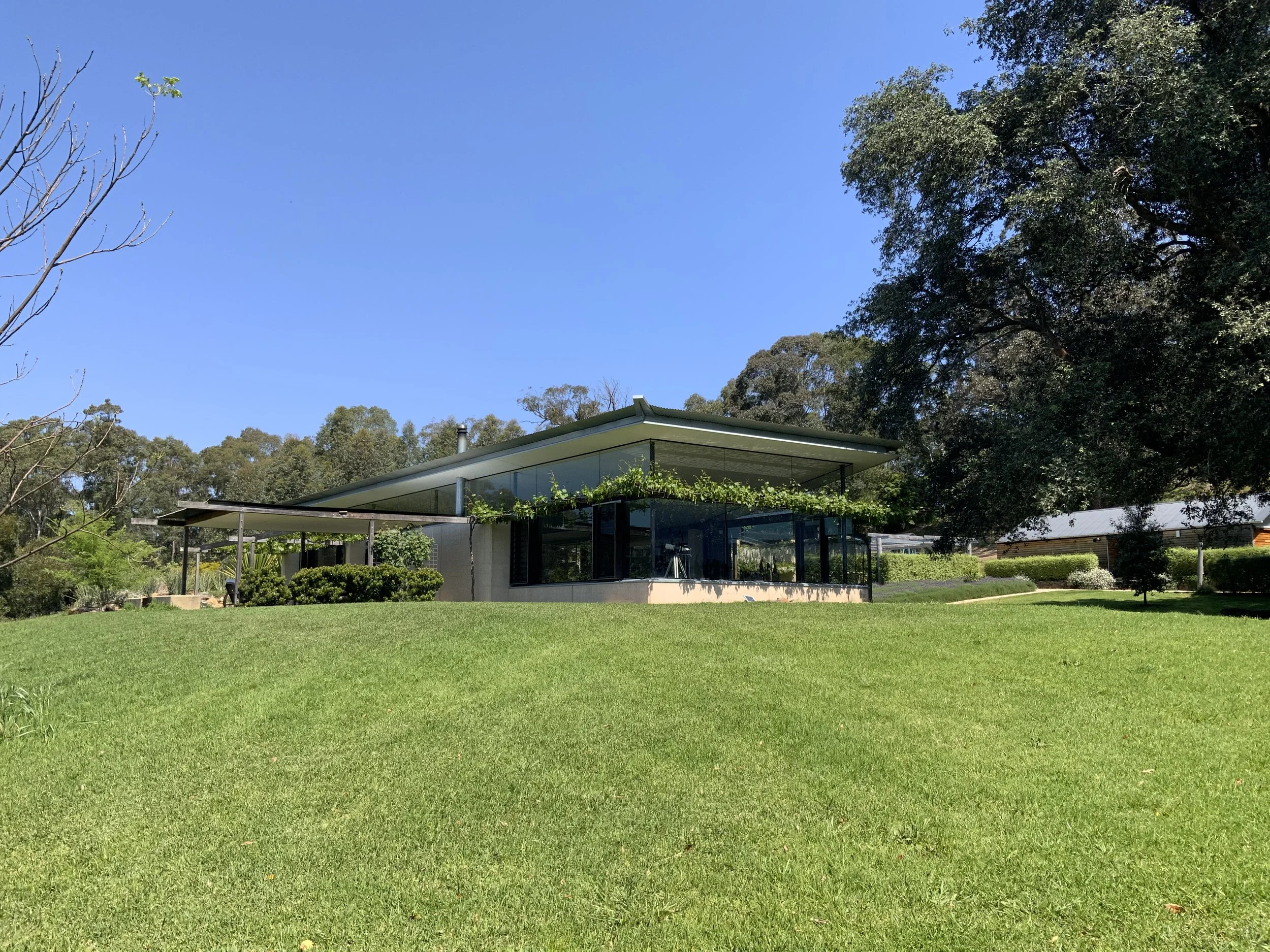 The new pavilion is set at 90 degrees to the main house, enclosing a soft courtyard centred around a dramatic copse of turpentine trees, the third side of which is defined by the existing loft and painting studio and workshop.