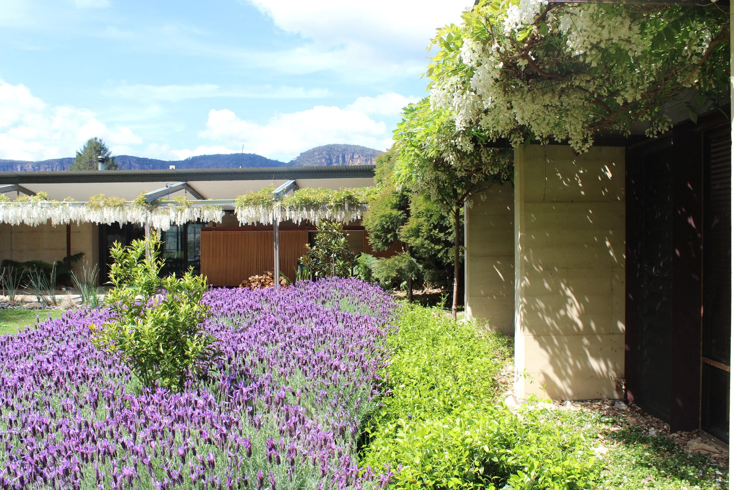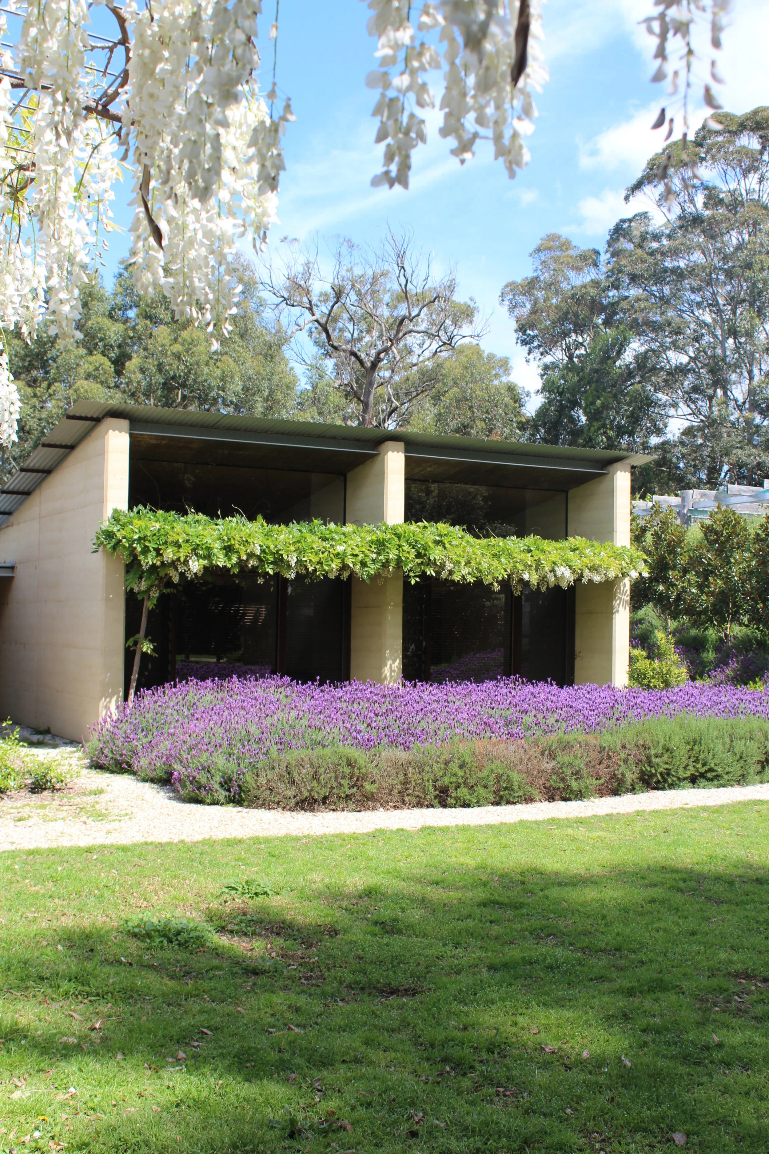 Although constructed from the same rammed earth walls as the main house, the form of the pavilion differs from the house, in that rather than opening up to the greater escarpment views, its roof is raised to frame the more immediate view of the turpentines, creating an intimacy more suitable to nature of bedrooms.