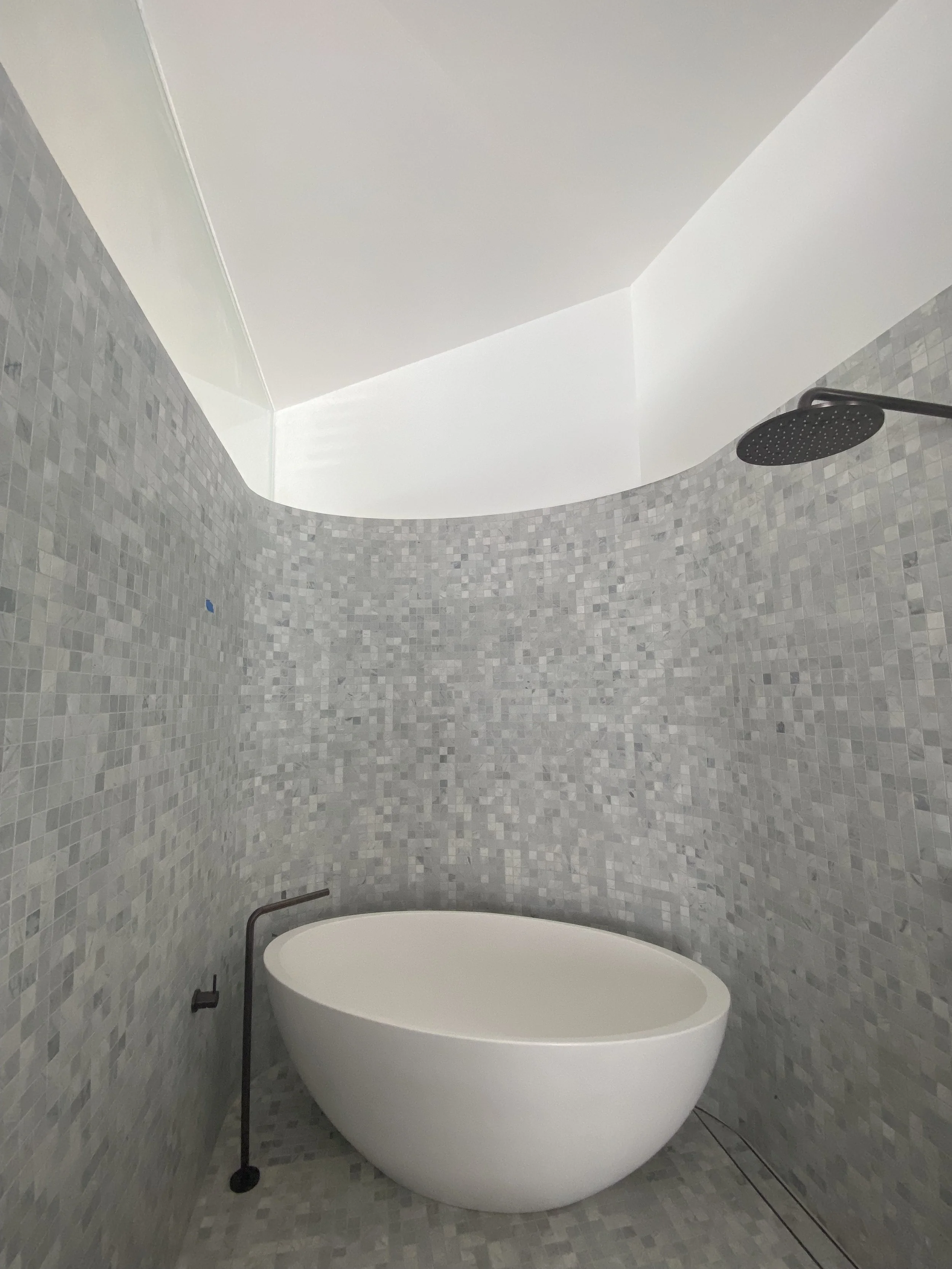 A restrained material palette enhances the home’s understated refinement. Softly painted brickwork is complemented by crisp render and a sculpted zinc roof, while lush planting introduces softness and texture . Internally, the sense of restraint is continued, with painted brickwork walls, crisp white joinery, elegant steel detailing, and soft timber surfaces. While the lower level is predominantly light and open, the upper floor bedrooms are largely lined in timber, creating an intimate and cocooning retreat.